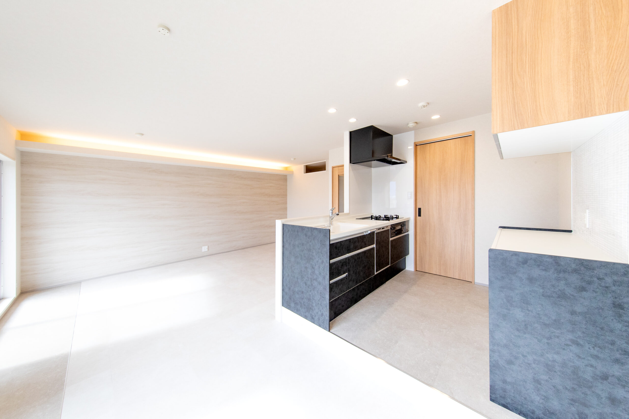 冷蔵庫置き場からゴミ箱の納まりまで含めて収納計画を整え