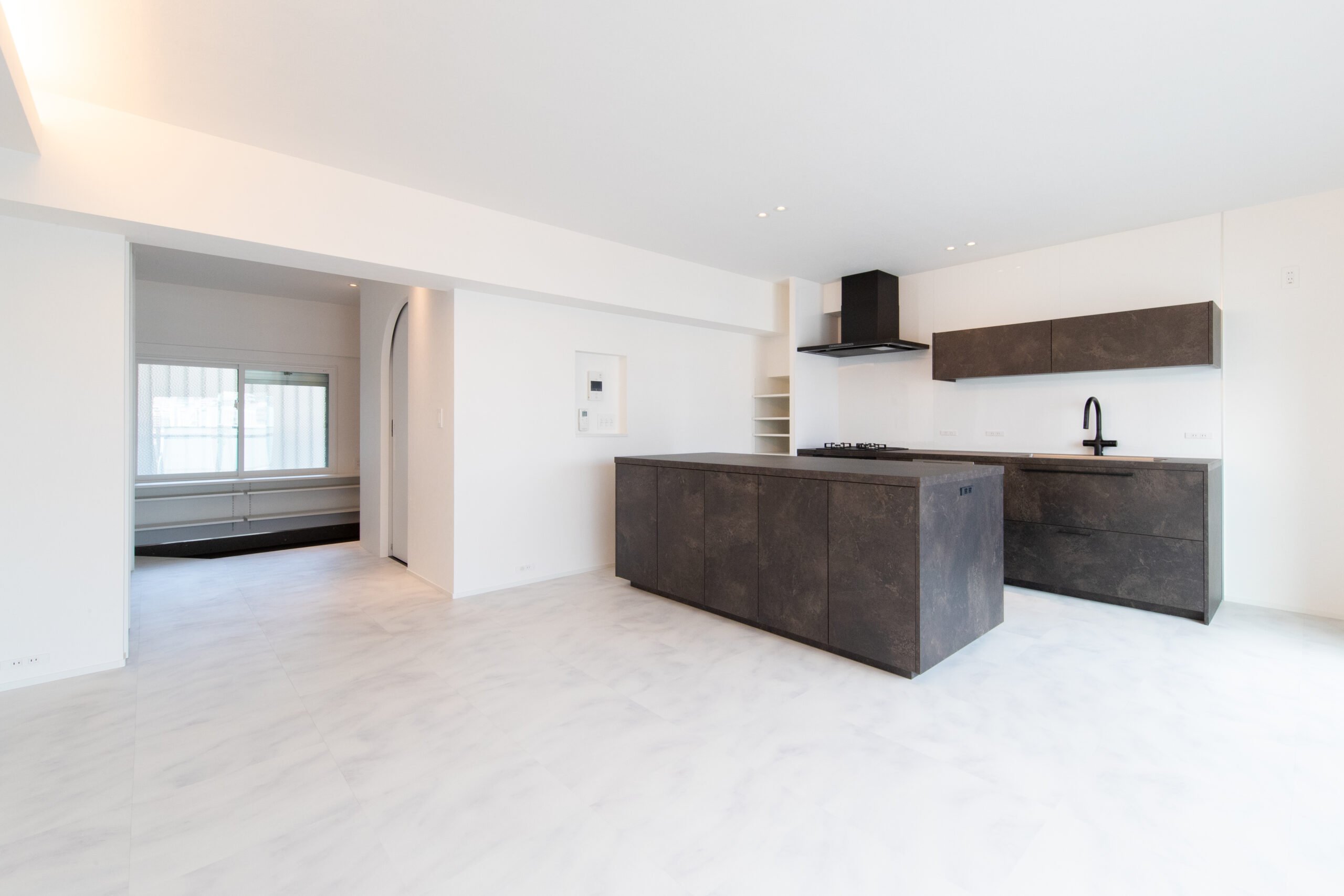 “寝室をつくらない”という考え方を取り入れながら、キッチンを主役にした空間設計、大容量の壁面収納、洗面室の新設、断熱性能の見直しまで行い、夫婦2人の暮らしにフィットする住まいへと整えました。