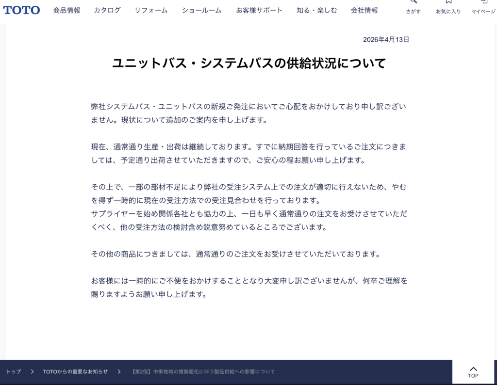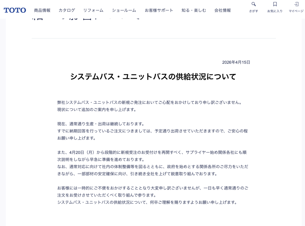 2026年4月中旬、TOTOのユニットバス受注停止をきっかけに、住宅設備業界全体で供給に関する動きが急速に広がっています。